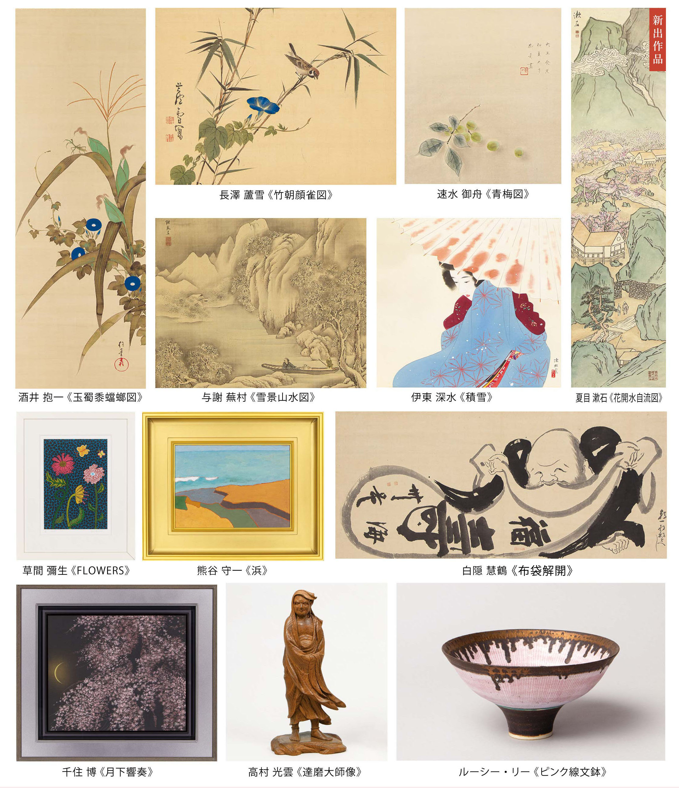 新画:横山大観、菱田春草、下村観山、西郷孤月、木村武山、上村松園、鏑木清方、伊東深水、村上華岳、速水御舟、千住博