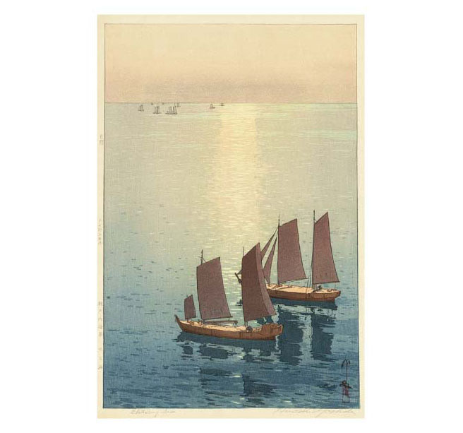 吉田博が本格的に木版画に取り組んだ初期の代表作《光る海》は、連作《瀬戸内海集》の第一作として1926年に制作されました。凪いだ瀬戸内海に静かに浮かぶ帆船と、水面にきらめく一筋の光の道。丸ノミの彫り跡を活かした表現が、まばゆい光の反射を生み出し、観る者の目を奪います。洋画と水彩画の修練を積んだ吉田ならではの観察眼が、伝統的な木版画に新たな風を吹き込みました。故ダイアナ元英国皇太子妃がケンジントン宮殿に飾っていたことでも知られる名品です。