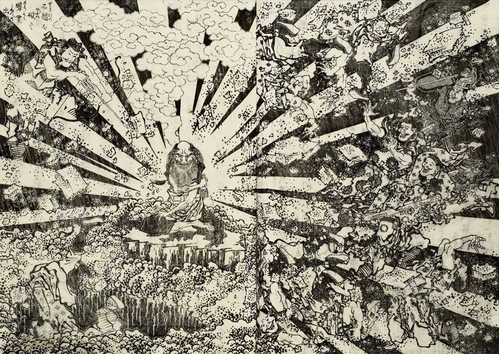 展示は「集中線・効果線」「爆発・閃光」「波や風など自然現象の可視化」「時間の経過」「妖怪・幽霊」「略画・一筆画」「ギャグ描写」「アニメ風原画」など、北斎の“技”を切り口に構成。現代のコマ割りや絵コンテに通じる造形感覚が、200年前の版面から立ち上がります。
