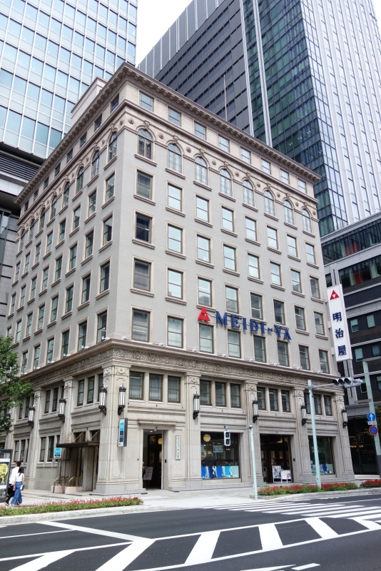 国登録有形文化財の繭山龍泉堂と壺中居 は、いずれも東畑謙三の設計。1960 年と 1973 年、時代の異なる仕事を歩いて比較 できるのはこの街ならではの楽しみです。 さらに、京橋のランドマークとして親しま れる、曾禰達蔵設計の明治屋京橋ビル(中央区指定有形文化財)もあわせて巡ることで、日本橋・京橋に流れる美意識を、建築の視点から読み解くこ とができます。(写真左から)繭山龍泉堂、壺中居、明治屋京橋ビル(提供:株式会社明治屋)