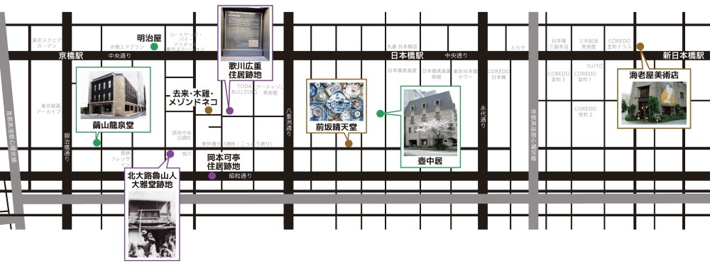 歌川広重が晩年を過ごし、北大路魯山人が拠点を構え、岡本 太郎の祖父岡本可亭へとつながる日本橋・京橋。食、浮世 絵、書、そして現代美術へと、多彩な文化の流れがこの地に 重なっています。文化人たちの足跡をたどりながら歩くこと で、日本橋・京橋が長い年月をかけて育んできた美の系譜を 感じていただけるルートです。 (写真左から)歌川広重住居跡の碑 (TODA BUILDING 裏)、魯山人がかつて営業した古美術店「大雅堂」(提供:飯田好日堂)